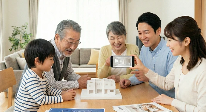 商談の場にいなかった奥様やご両親にも、模型なら伝わる。さらに、ご自宅でスマホをかざせばARでリフォーム後の空間をその場で体感できます。「お父さんが言ってた新しい家、これだよ」と家族全員が同じ空間を共有することで、合意形成が圧倒的に早くなります。模型が、あなたの代わりに自宅で営業を続けます。